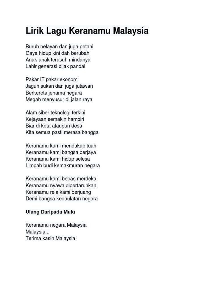 Categories wallpaper Tags keranamu lagu lirik malaysia. Menghafal lirik lagu Keranamu Malaysia. Lirik lagu ini mengandungi identiti bendera negara yang menyeru masyarakat untuk menghayati dan mengibarkan bendera Malaysia dengan penuh kemegahan dan cintakan negara.